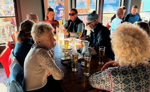We were around 40- 50 skiers gathered for our initial pre-ski 10 am briefing with a handful already on the trail sporting Silver Hares Kits. Our ski was followed by a strong turnout at Après ski lunch with 40 Hares happily socializing. An interesting and not unusual happening is that we regularly have people joining our group for lunch who for one reason or another didn’t ski with us that day or even ski with us at all, just friends of friends, all are welcome